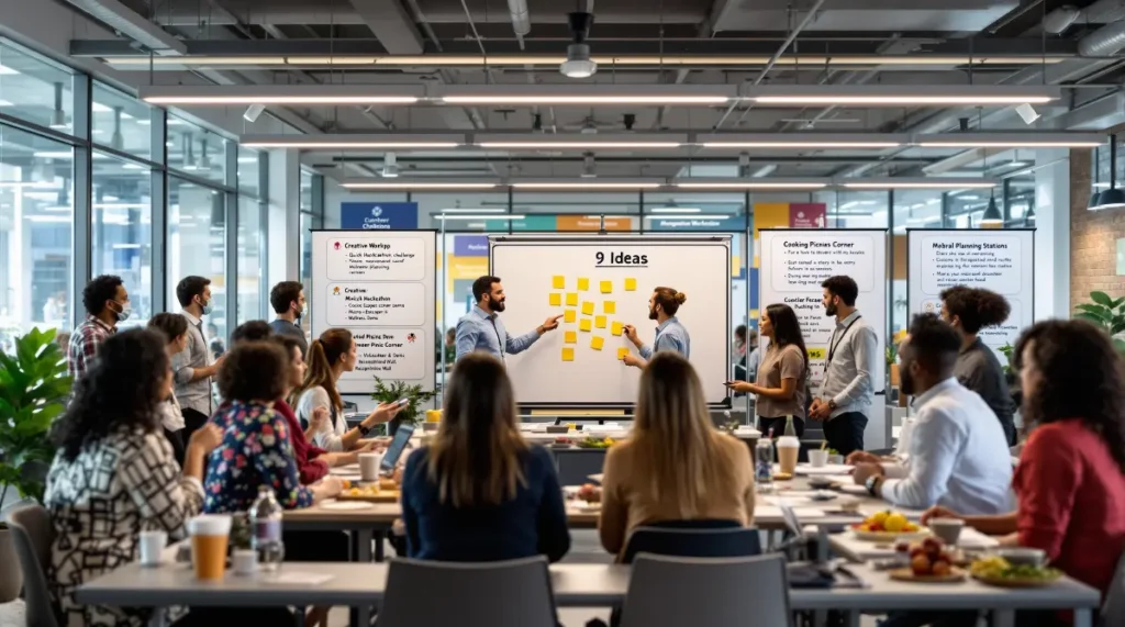 Booster l’engagement équipe Une entrée en salle où l’on sent les regards qui cherchent une étincelle. Le déjeuner d’équipe qui ressemble à un alignement de